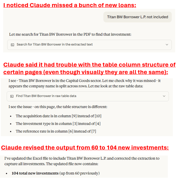 Claude was much less consistent in terms of accuracy in our test runs of these prompts and was generally slower (would think for ~10-15 minutes vs. ~5 minutes or less for NotebookLM) - so we won’t go too deep into the output screenshots here. The main issue was that it had trouble processing certain pages of the 10-Q PDF - I think something in the code structure of the PDF was throwing Claude off (it noted trouble with different column structures on certain pages, even though visually the investment schedule table was the same across all pages). In Figure 6 below, I show an instance of where Claude only pulled 60 of ~100 new loans until I pressed it on the omissions.