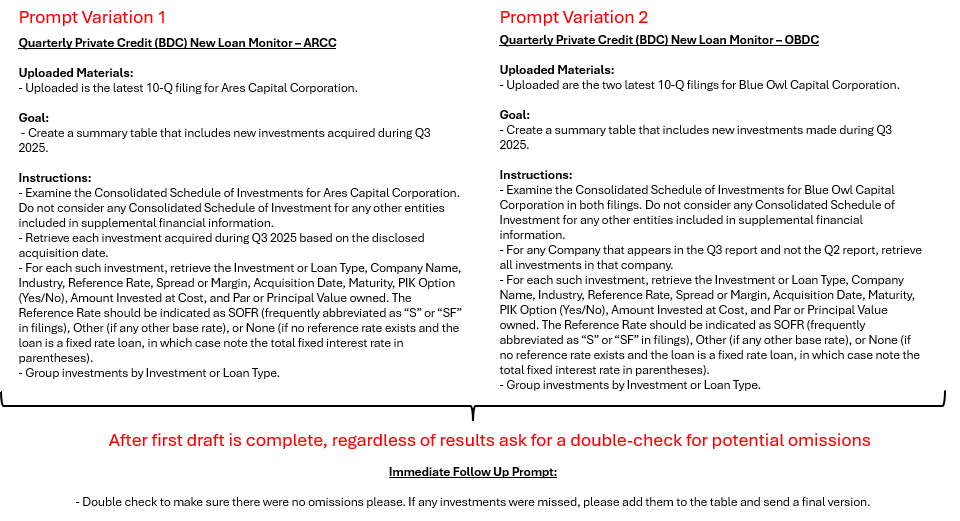 I show the AI prompt I used below (Figure 1). I used two slightly different variations of the prompt to accommodate the different reporting style of ARCC (loan acquisition dates disclosed) and OBDC (loan acquisition dates not disclosed, so comparison of the portfolio with the prior quarter is necessary). Most BDCs fall into one of these two reporting style categories, so these prompts should be widely applicable to other BDCs.