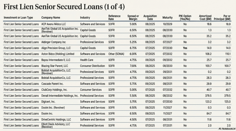 Figure 2: Partial ARCC Output. Here are some interesting things you can see right when the 10-Q is posted: 1L unitranches being priced as low as S+425-450 (!), Nexus Buyer 2L deal priced at S+575 (which is a +225bp spread over the 1L broadly syndicated tranche), while subordinated/pref risk is being priced in the 12-15% range w/ PIK.
