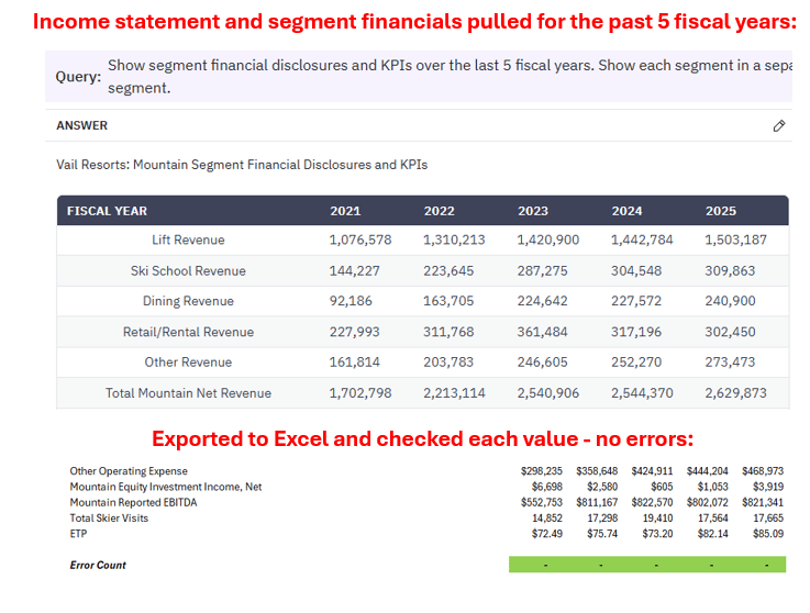 First, I tested the Co-Analyst’s ability to pull historical income statement and annual segment financials/KPIs as reported in the last 5 fiscal years (using Vail ($MTN) as an example once again). I found that my prompts had to be very clear that I wanted the layout to be exactly as reported in the financials, with each segment shown separately, in order to ensure that all disclosed line items were pulled (not just summary line items like total revenue and EBITDA by segment). After adjusting my prompt, the end result was that all numbers were pulled correctly for both the income statement and segment financials - I checked all 360 cells (Figure 3).