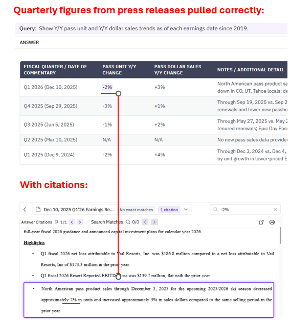 Next, I wanted to test the Co-Analyst’s ability to pull unstructured data, which takes the most manual effort to compile. In the case of Vail, management reports ski pass sales trends for the upcoming season (unit and dollar sales trends Y/Y) along with its earnings releases, but this information is usually included in sentence form (unstructured quantitative data). The data is also reported as of a date near the earnings date, rather than as of the fiscal quarter end, so to get accurate results I had to be specific in my prompt to ask for sales trends as of each earnings date rather than as of each quarter (I found the Co-Analyst would get confused if I asked for trends as of each fiscal quarter, since the trends reported along with fiscal Q1 earnings for example are as of a date that is post-quarter-end and technically within fiscal Q2). Once again, with the right prompt all numbers were pulled correctly for the past 20 quarters. It’s easy to see the efficiency gains here - instead of locating a specific sentence in 20 different press releases and putting all of the data in a table, I can pull all of these data points in a few seconds (Figure 4).