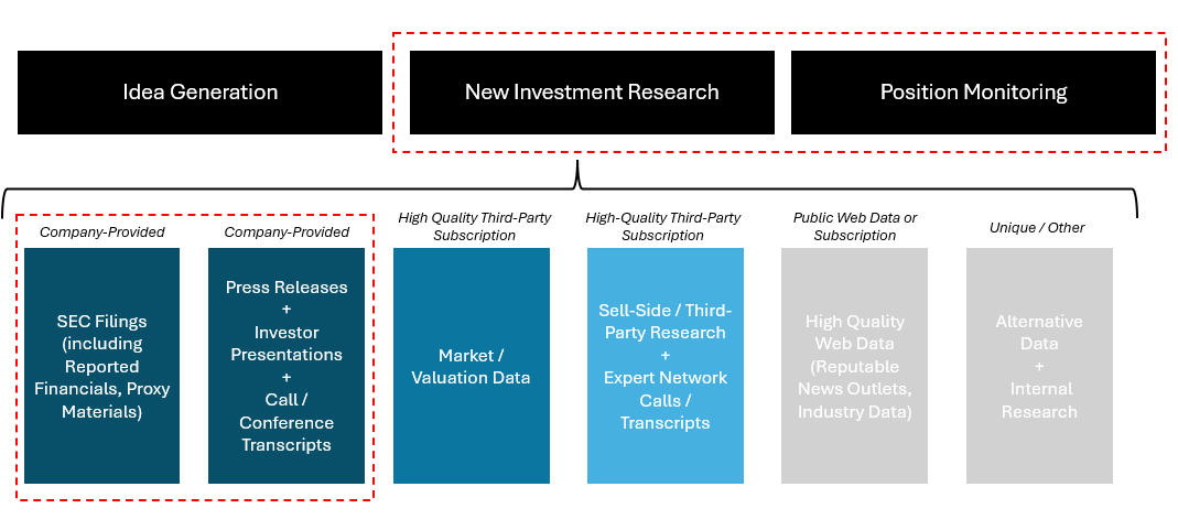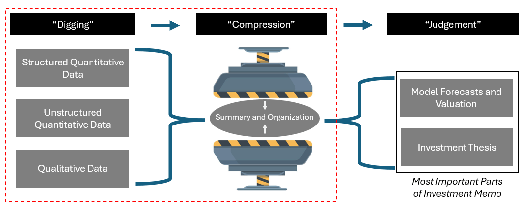 In my mind, most of the work a buyside analyst does (no matter which workflow category) can be dissected into a three part process - digging, compression, and judgement. Digging involves finding and pulling the relevant data/info - from structured quantitative (ie. financial tables), unstructured quantitative (ie. KPI’s within sentences in a press release), and qualitative sources (ie. management comments on a conference call). Compression involves squeezing that data by summarizing/organizing it into a usable format (either in a model or summary notes) to be processed in the final stage of the process, judgement. Judgement involves assessing and weighing all of the compressed information to create model forecasts, valuation analysis, and an investment thesis (all of which are key parts of a final investment memo/recommendation).